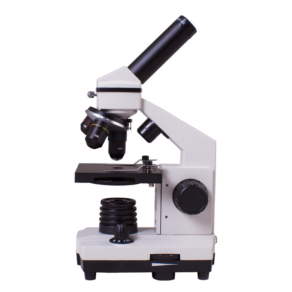 Прибор комплектуется тремя объективами, с которыми микроскоп дает увеличения 64, 160 и 640 крат. В конструкции объектива 40хs использован специальный пружинный механизм – даже если начинающий биолог увлечется и случайно заденет объективом препарат, подпружиненный объектив отодвинется, и ни оптика, ни препарат не повредятся.