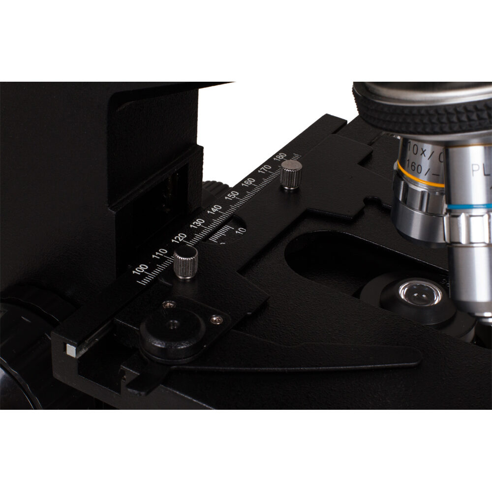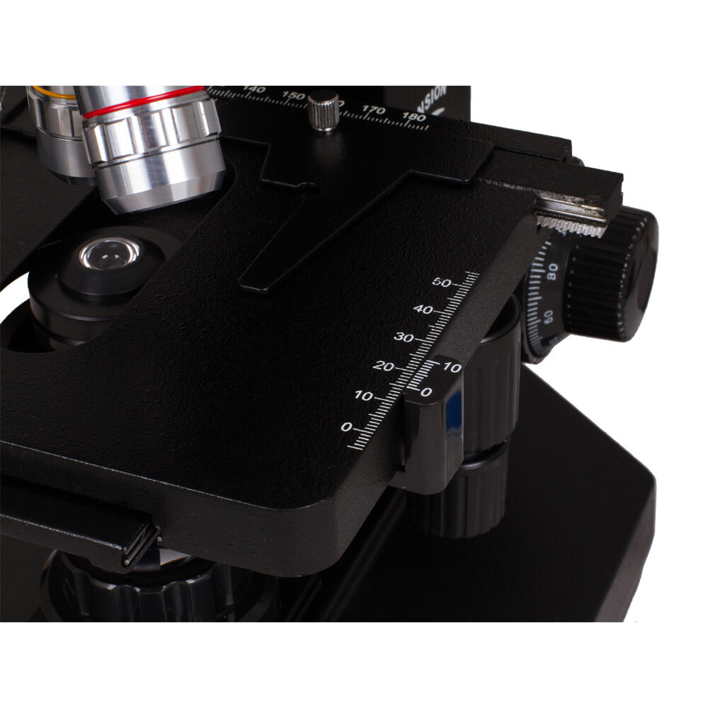 Фокусировка микроскопа Levenhuk 870T производится за счет винтов грубой и точной настройки резкости. Рукоятки фокусировки позволяют перемещать предметный столик в вертикальной плоскости для точного наведения резкости, объектив же остается неподвижным. Также столик перемещается и в горизонтальном направлении, так как он двухкоординатный. Размеры столика 140х155 мм. Благодаря мягкому движению фокусировки и механизма перемещения столика все настройки меняются плавно, без рывков. Фокусировка имеет следующие шаги: грубая — 25 мм, точная — 0,002 мм