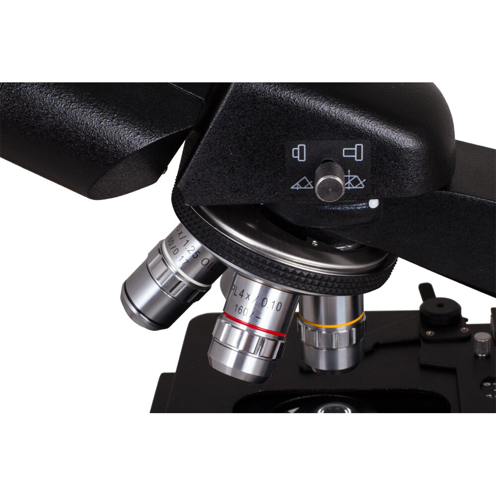 Levenhuk 870T оснащен поворотной (360°) тринокулярной насадкой, с углом наклона в 30°. Четыре объектива в револьверном устройстве, классический (по Келеру) тип освещения, возможность регулировки апертурной и полевой диафрагм делают этот микроскоп превосходным инструментом для серьезных наблюдений.