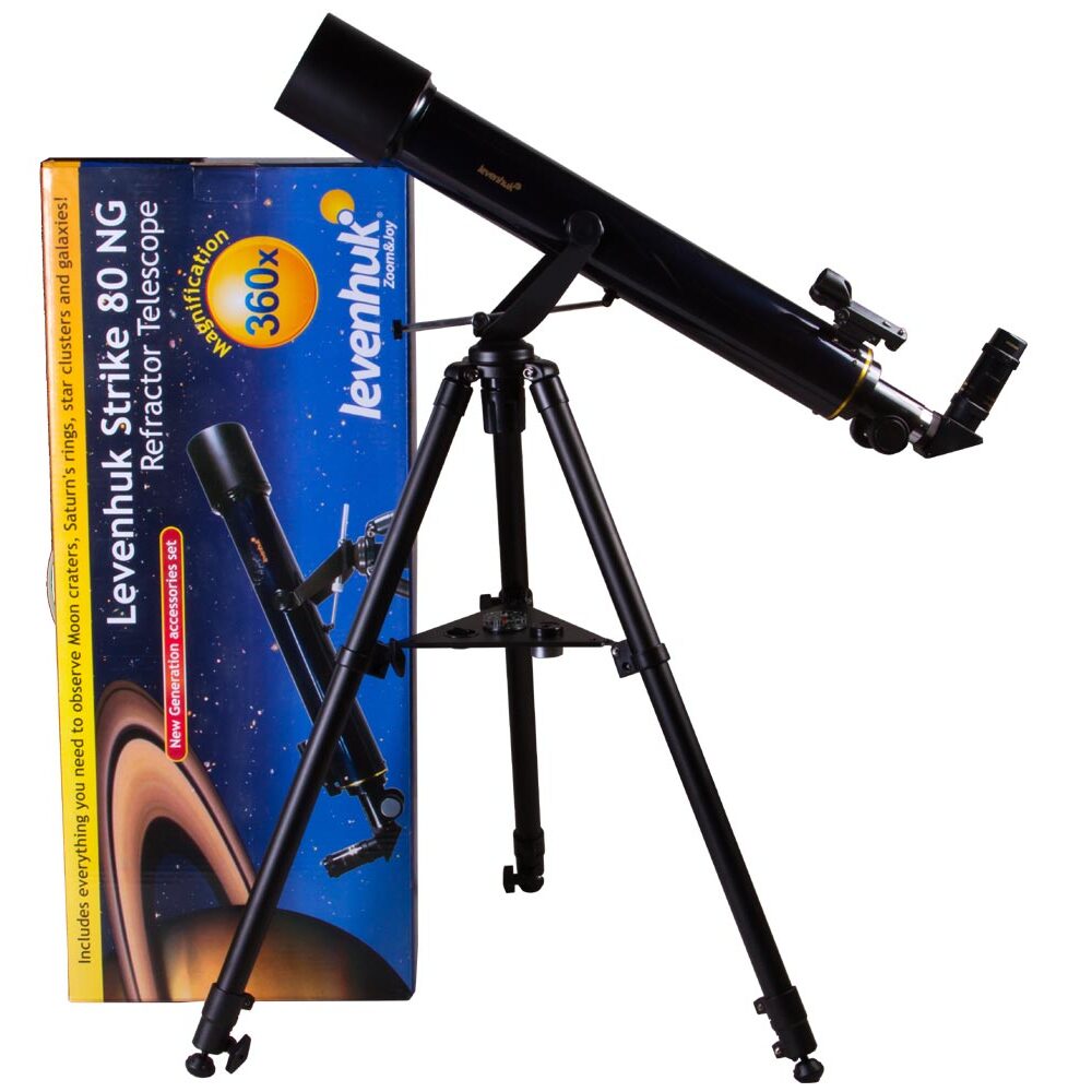 Старшая модель серии Levenhuk Strike 80 NG, которая отличается большими оптическими возможностями. Это рефрактор-ахромат на легкой азимутальной монтировке, который хорошо подойдет для начинающих любителей астрономии любого возраста. Благодаря не имеющей аналогов богатой комплектации, включающей все необходимое для проведения наблюдений, будет отличным подарком для любознательного подростка. В этот телескоп можно рассмотреть множество деталей на лунной поверхности (кратеры и другие детали поверхности крупнее 5 километров), кольца Сатурна, облачные пояса и спутники Юпитера, фазы Венеры, яркие кометы, туманности и галактики, множество двойных и кратных звезд, звездных скоплений и других интересных объектов.