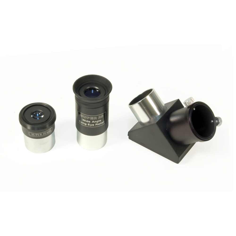 С телескопом поставляются 2 симметричных окуляра, имеющие фокусные расстояния 10 мм и 25 мм и дающие с телескопом увеличение 150 и 60 крат. Линзы окуляров изготовлены из стекла и имеют многослойное просветление. Фокусировка выполняется подвижкой главного зеркала с помощью удобной ручки с плавным ходом. С помощью дополнительных окуляров увеличение телескопа может быть поднято до полезного предела в 250 крат.