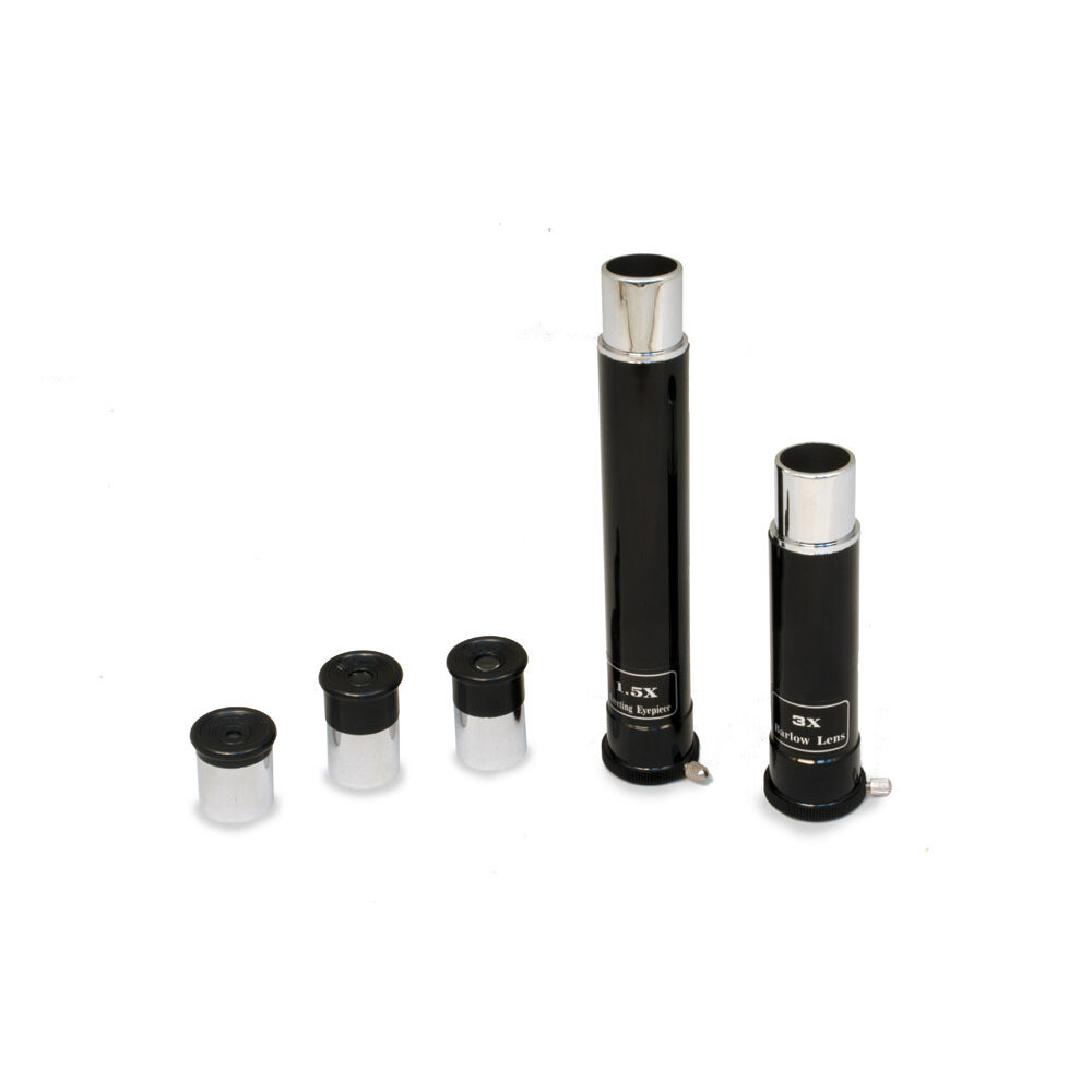 В комплект входят 3 окуляра и трехкратная линза Барлоу, позволяющая увеличить фокусное расстояние телескопа в 3 раза! Для обзорных наблюдений лучше использовать окуляр 20 мм (30x). Чтобы изучить объект более подробно, рекомендуется воспользоваться окулярами 12,5 мм (48x) и 4 мм (150x). Оборачивающий окуляр 1,5x необходим для наземных наблюдений: он дает неперевернутое и не зеркальное изображение.